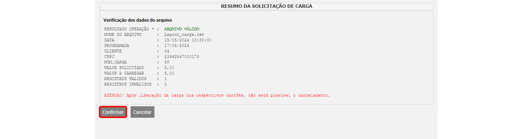 Caso o arquivo seja válido você será enviado para a tela de confirmação.