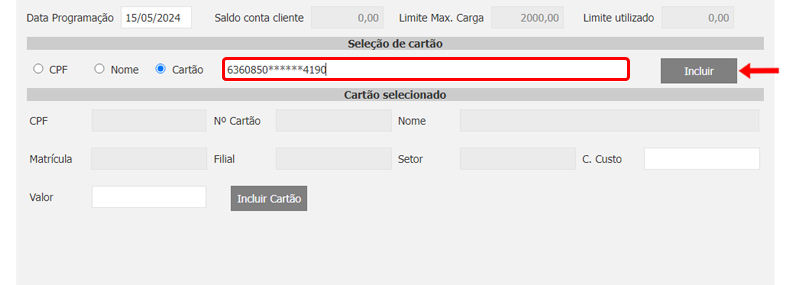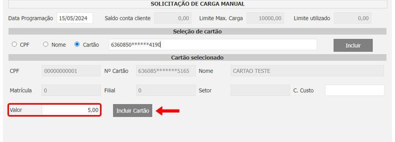 Após isso insira o valor da carga e clique em “Incluir Cartão”.