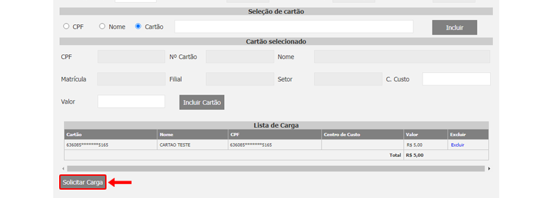 Depois de todos os cartões desejados serem incluídos clique em “Solicitar Carga”.