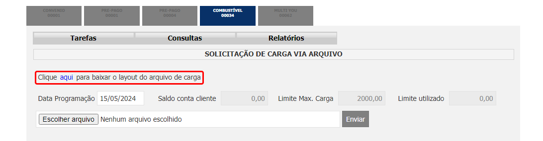 Com o arquivo preenchido, volte ao sistema, selecione a data para qual deseja programar a sua carga, escolha o arquivo e clique em enviar.