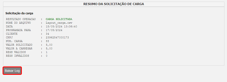 Pronto a sua solicitação de carga foi enviada e o Log será baixado logo em seguida.