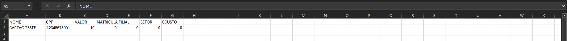 Os dados obrigatórios são “NOME”, “CPF” e “VALOR” caso não haja a necessidade de informações como “MATRICULA”, “FILIAL”, “SETOR” e “CCUSTO” preencha os mesmos com o valor “0”